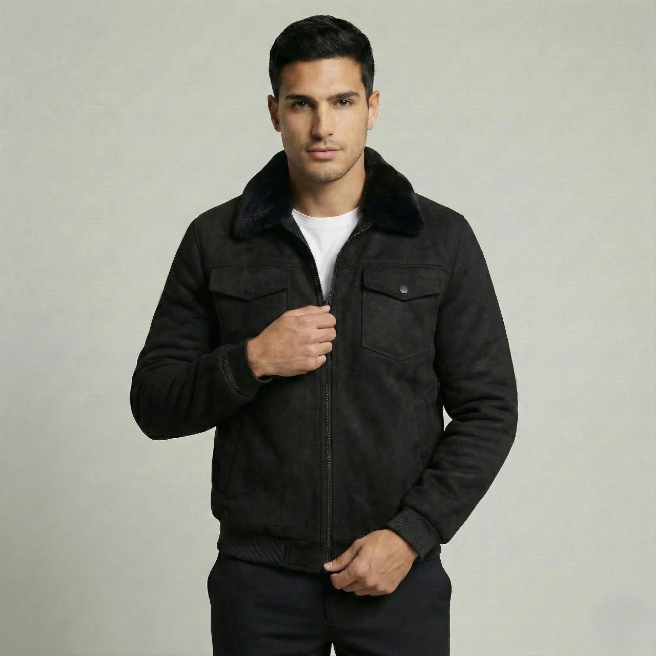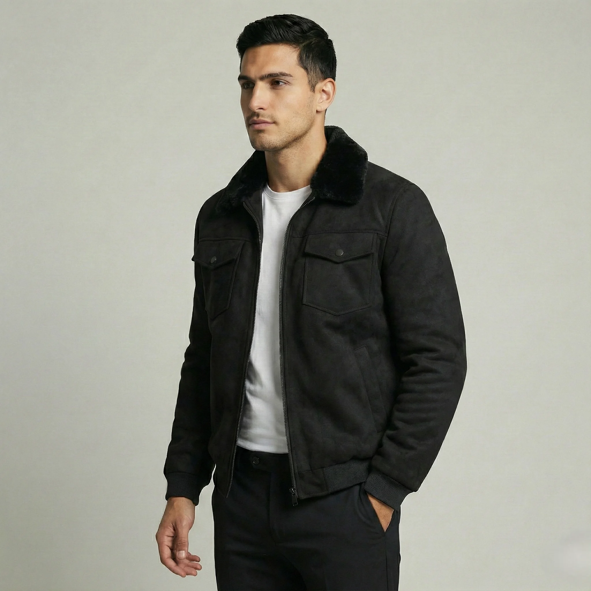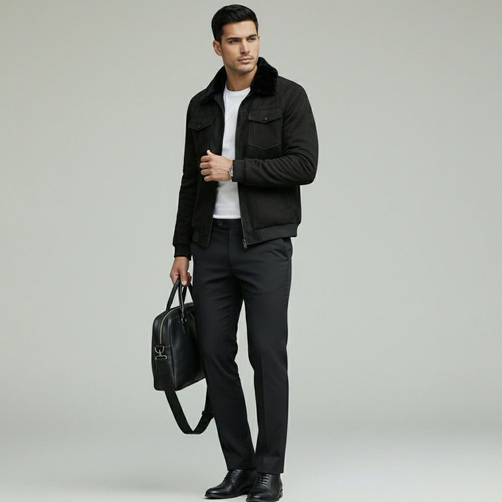 Experience effortless winter style with this Men’s Black Faux Suede Jacket featuring a soft White fur collar, warm lining, and a modern tailored fit—perfect for casual outings, everyday wear, and smart winter styling.