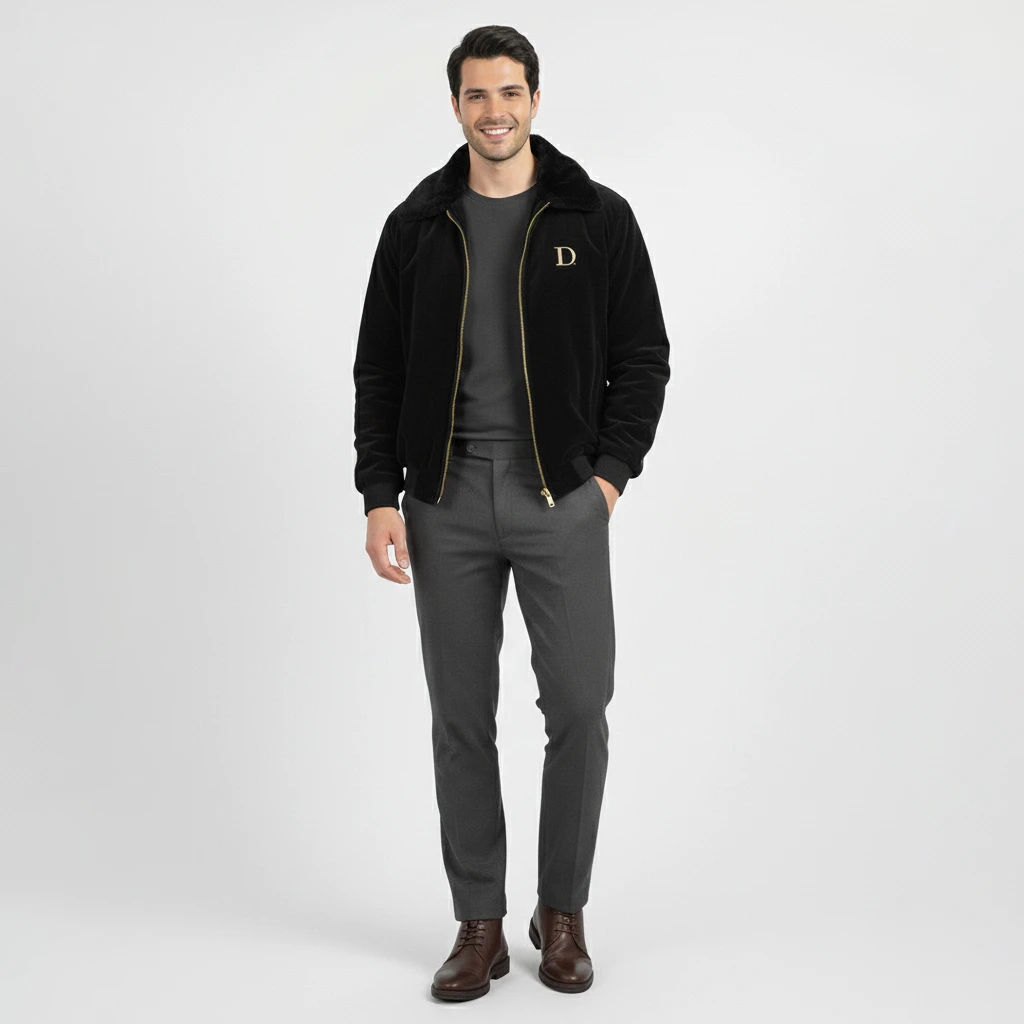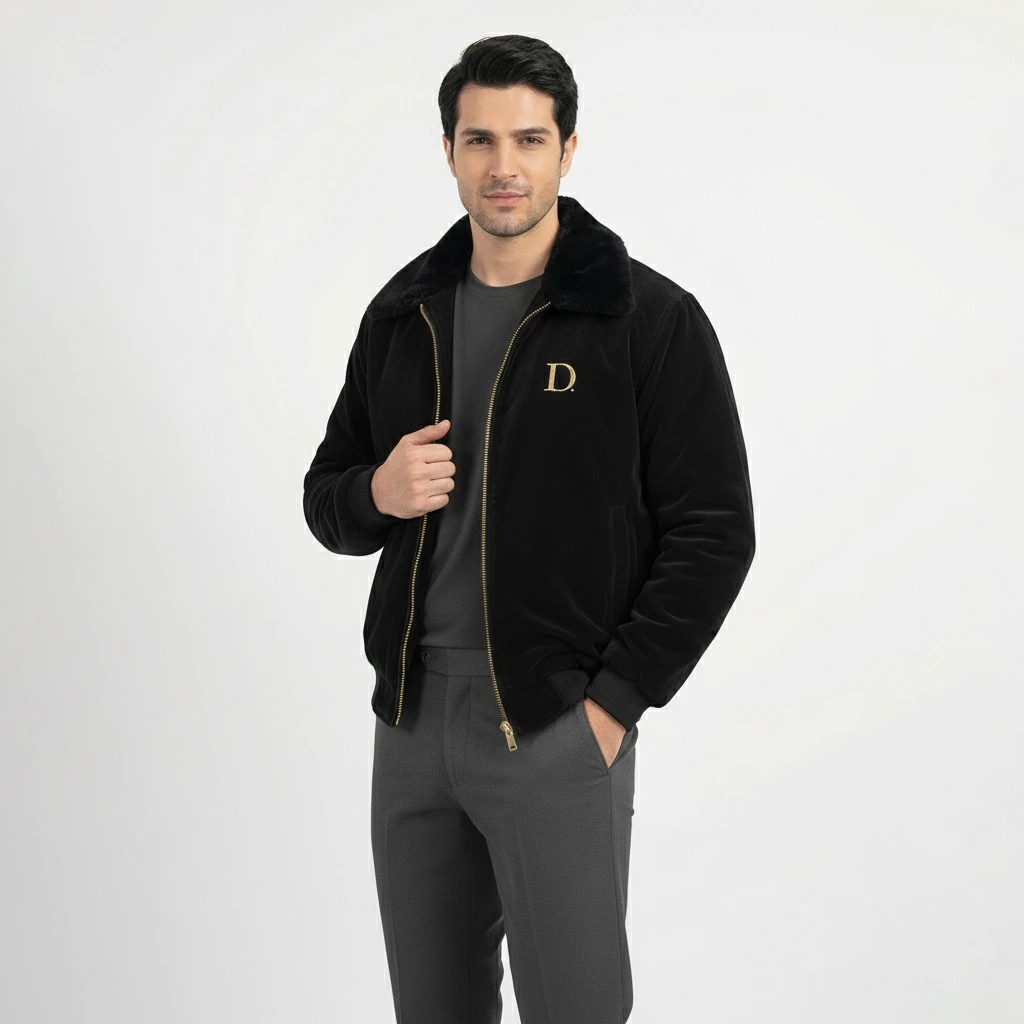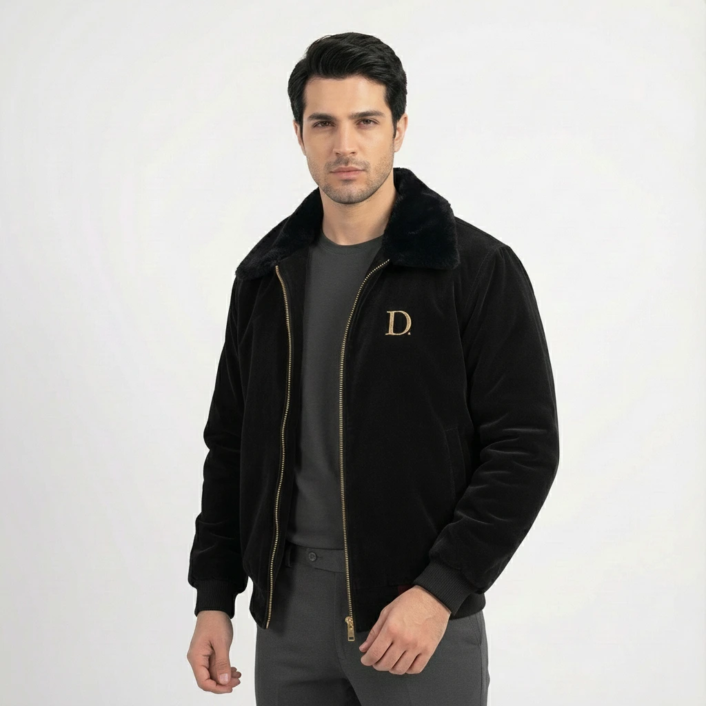 A premium black velvet winter jacket featuring a soft fur collar, smooth zipper, ribbed cuffs, and a luxurious finish—designed for warmth, comfort, and a refined winter look.
