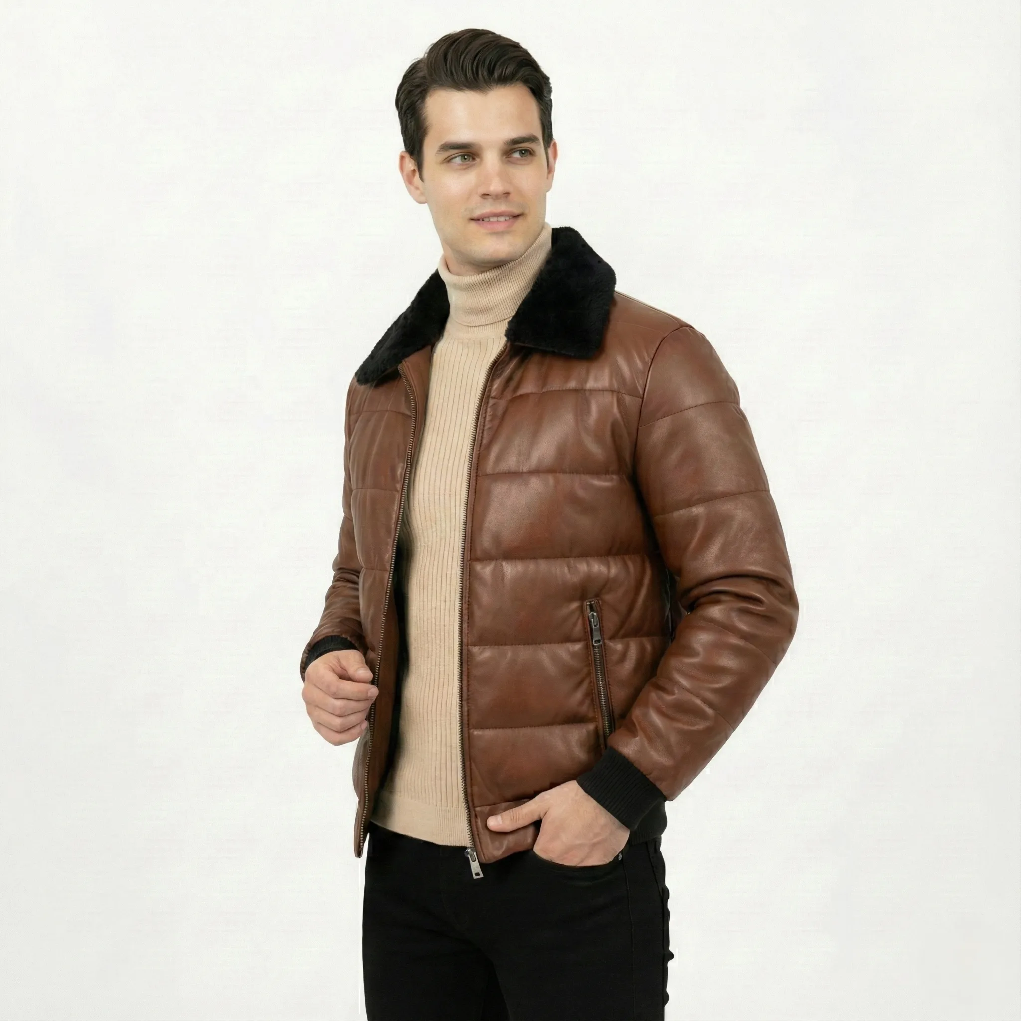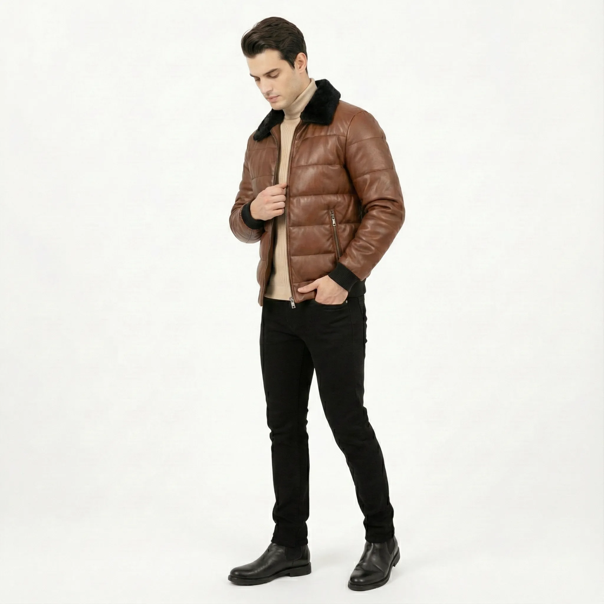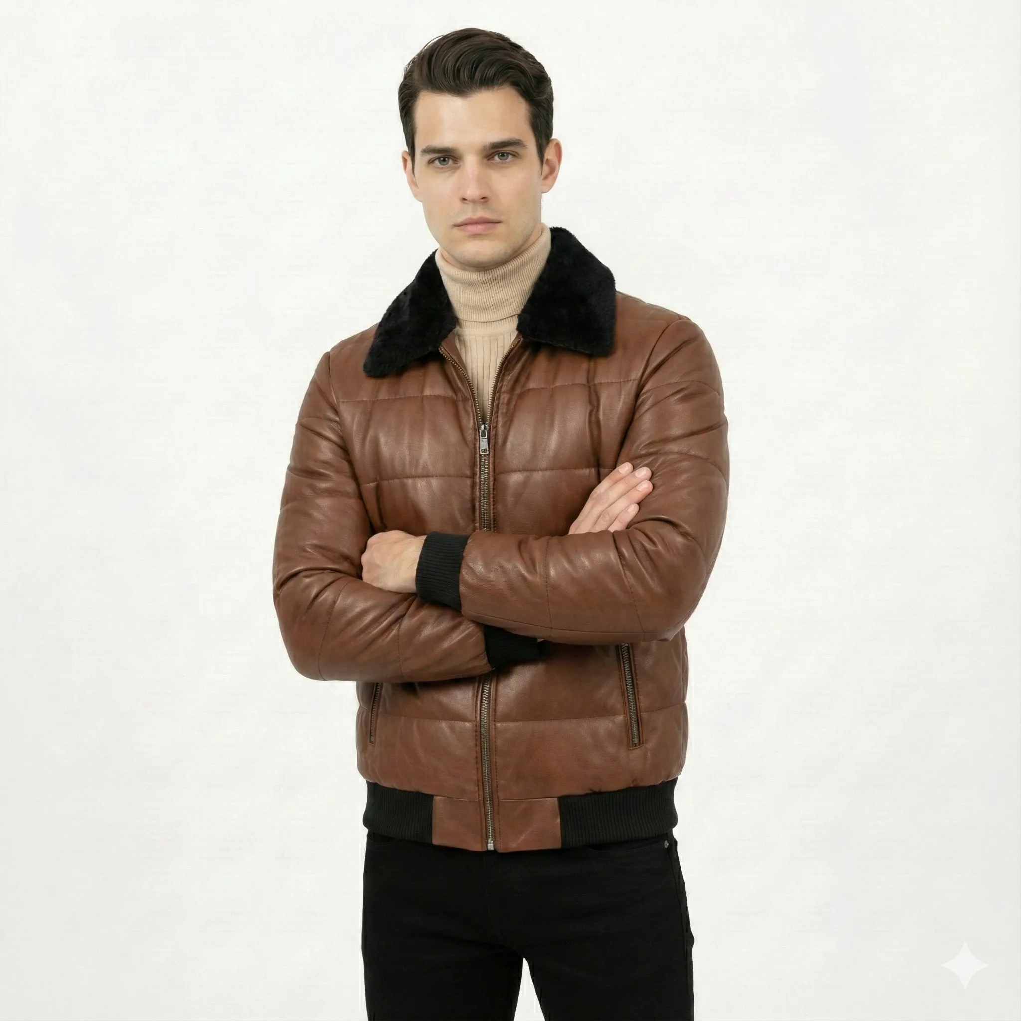 This brown faux leather puffer jacket with a luxurious fur collar is the perfect blend of style and functionality for winter. Designed to keep you warm while elevating your fashion game, this jacket features a sleek quilted pattern and bomber-style fit that exudes modern sophistication. The soft ribbed cuffs and hem provide a snug fit, while the high-quality faux leather and fur detailing add a touch of premium elegance. Whether you’re heading out for a casual outing or a night in the city, this jacket promises to be your go-to outerwear for both warmth and standout style.