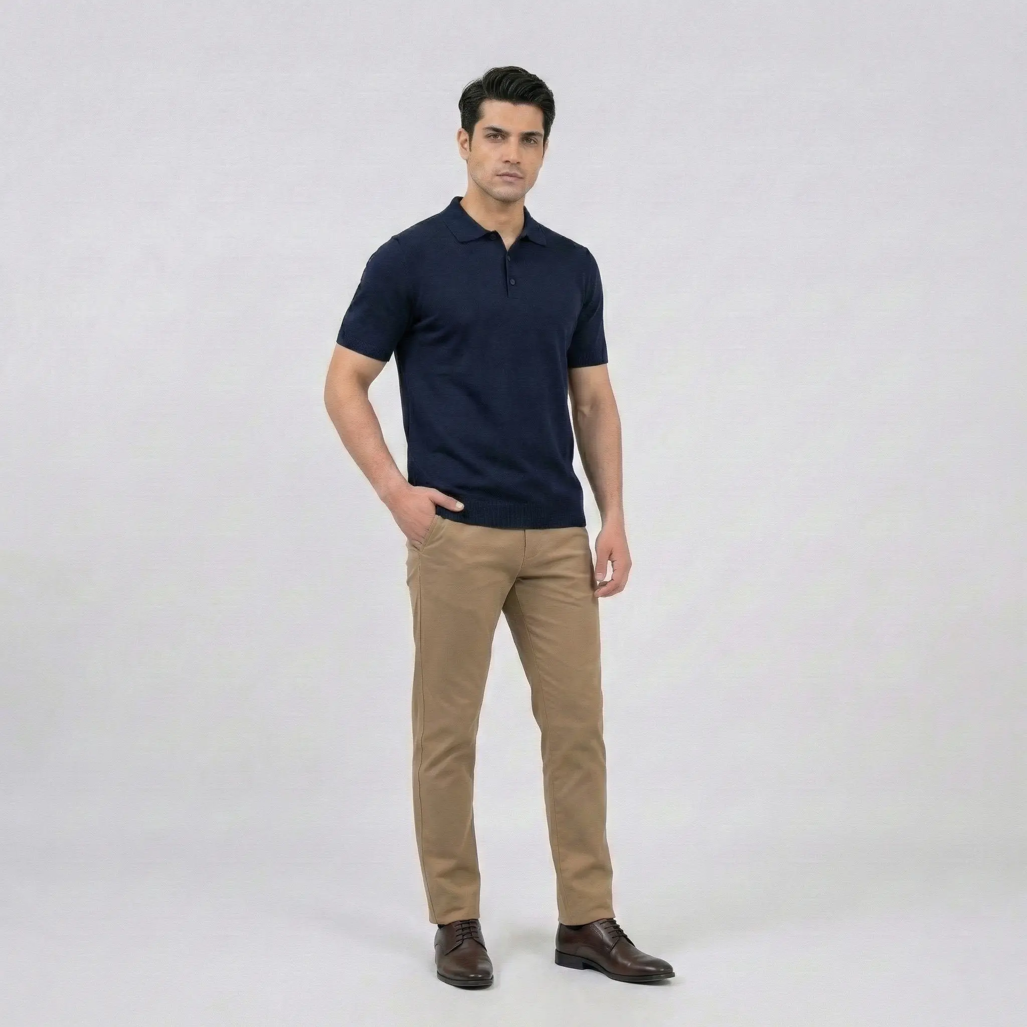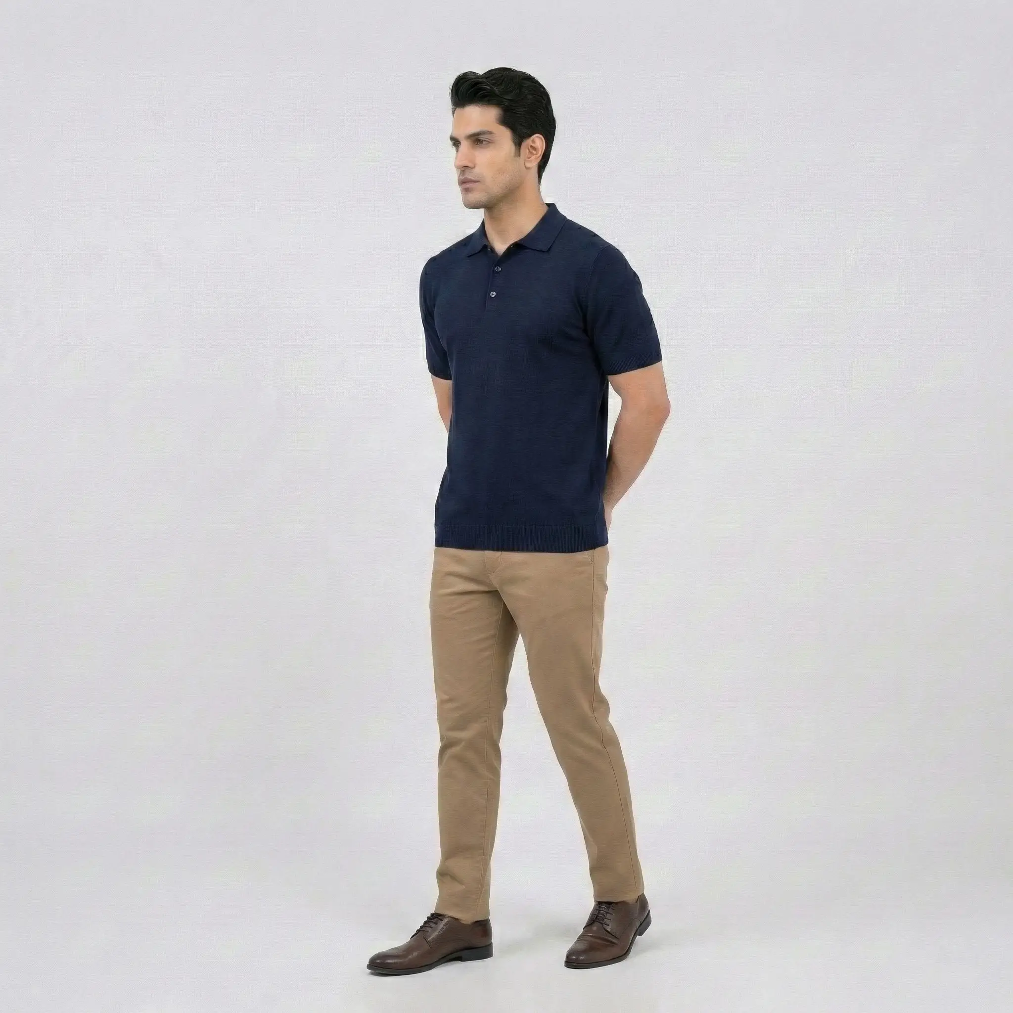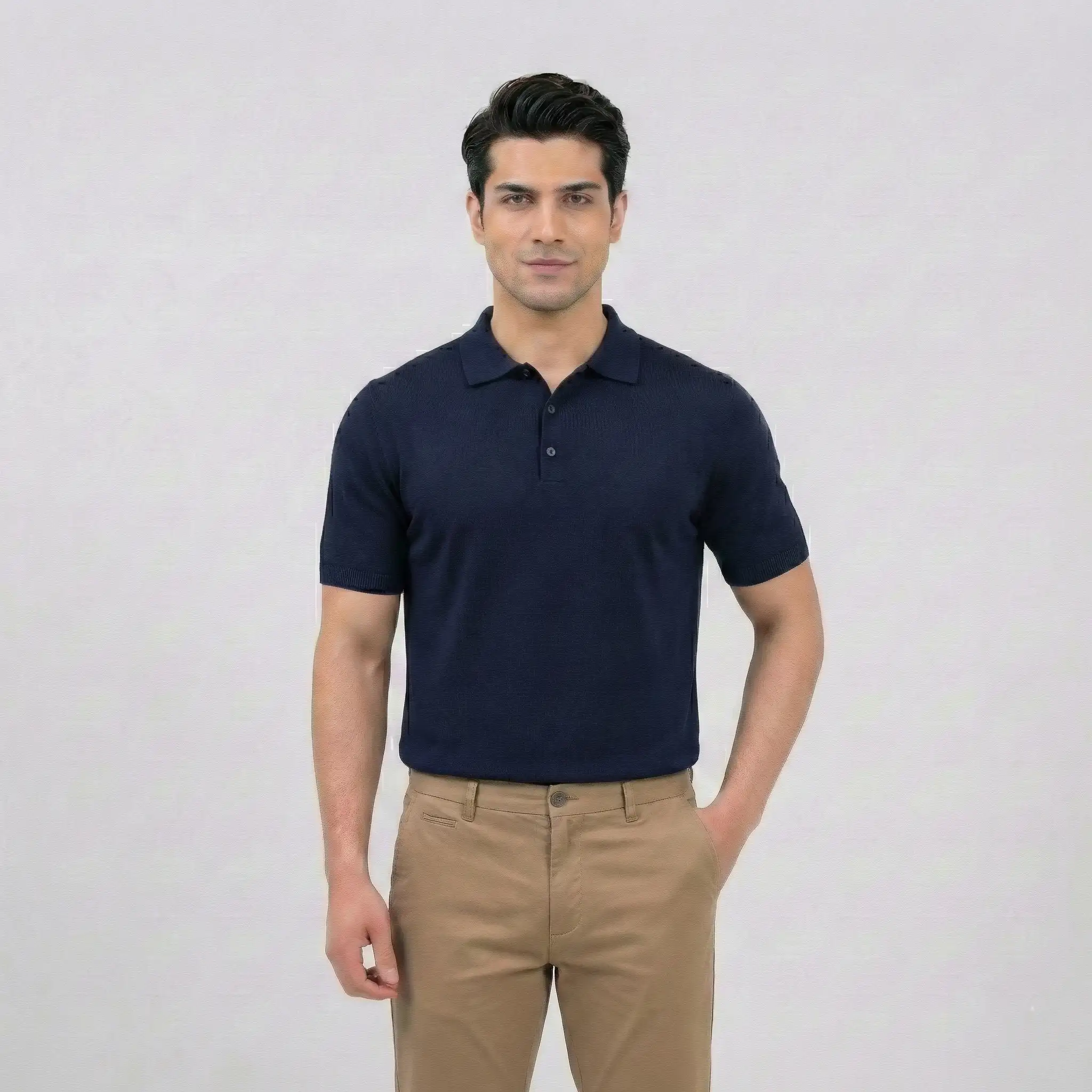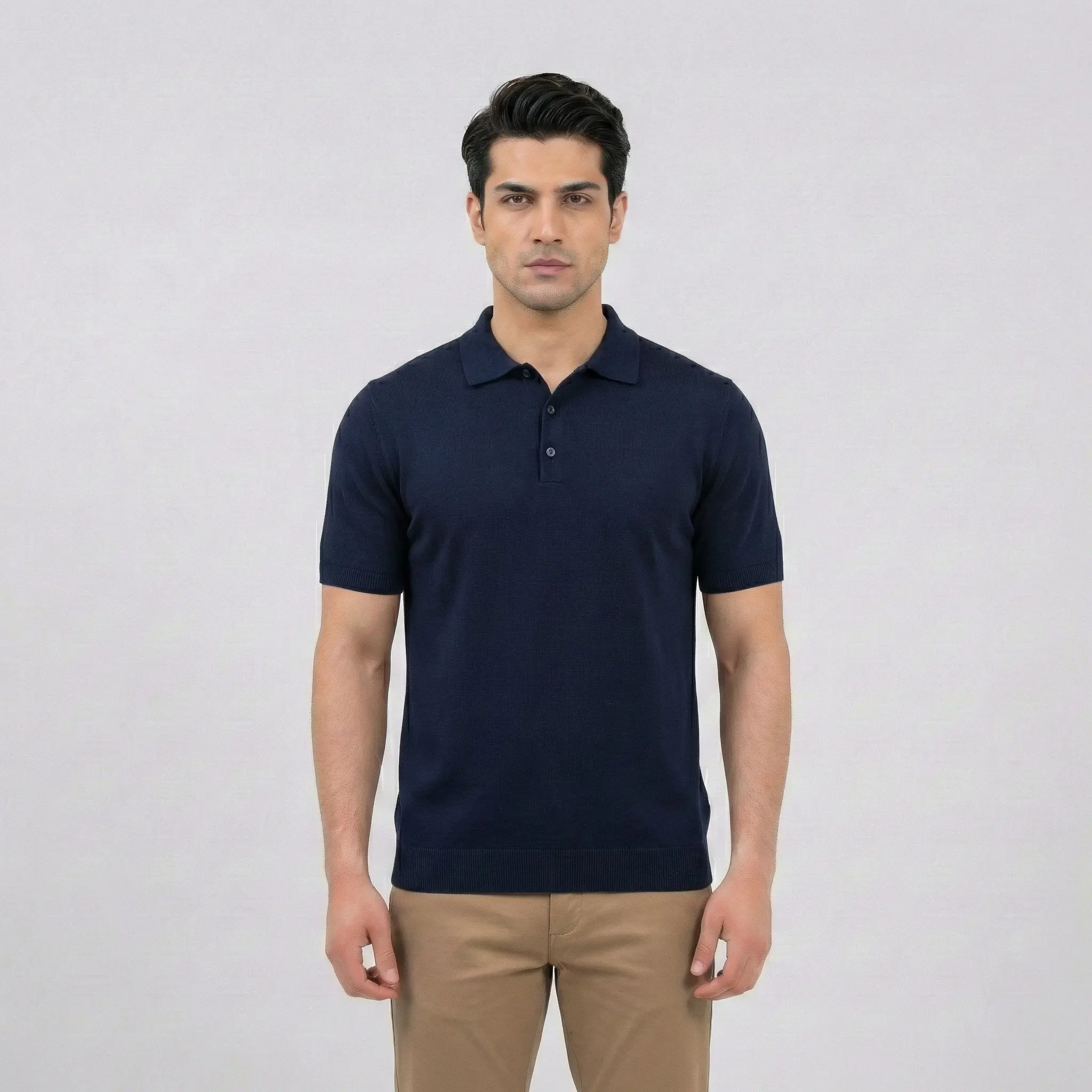 A timeless wardrobe staple. This navy blue polo features a premium fine-knit texture and a classic three-button design, offering a sleek and polished look for any occasion.