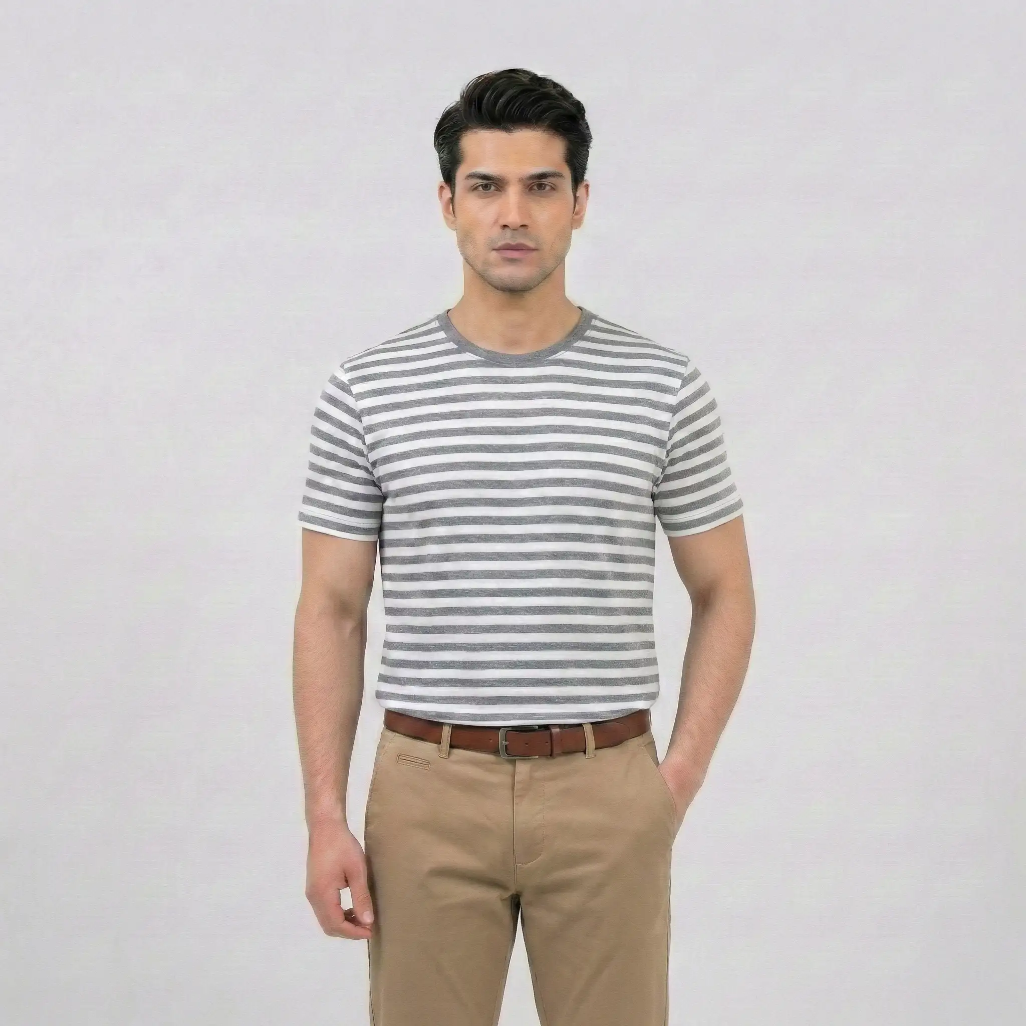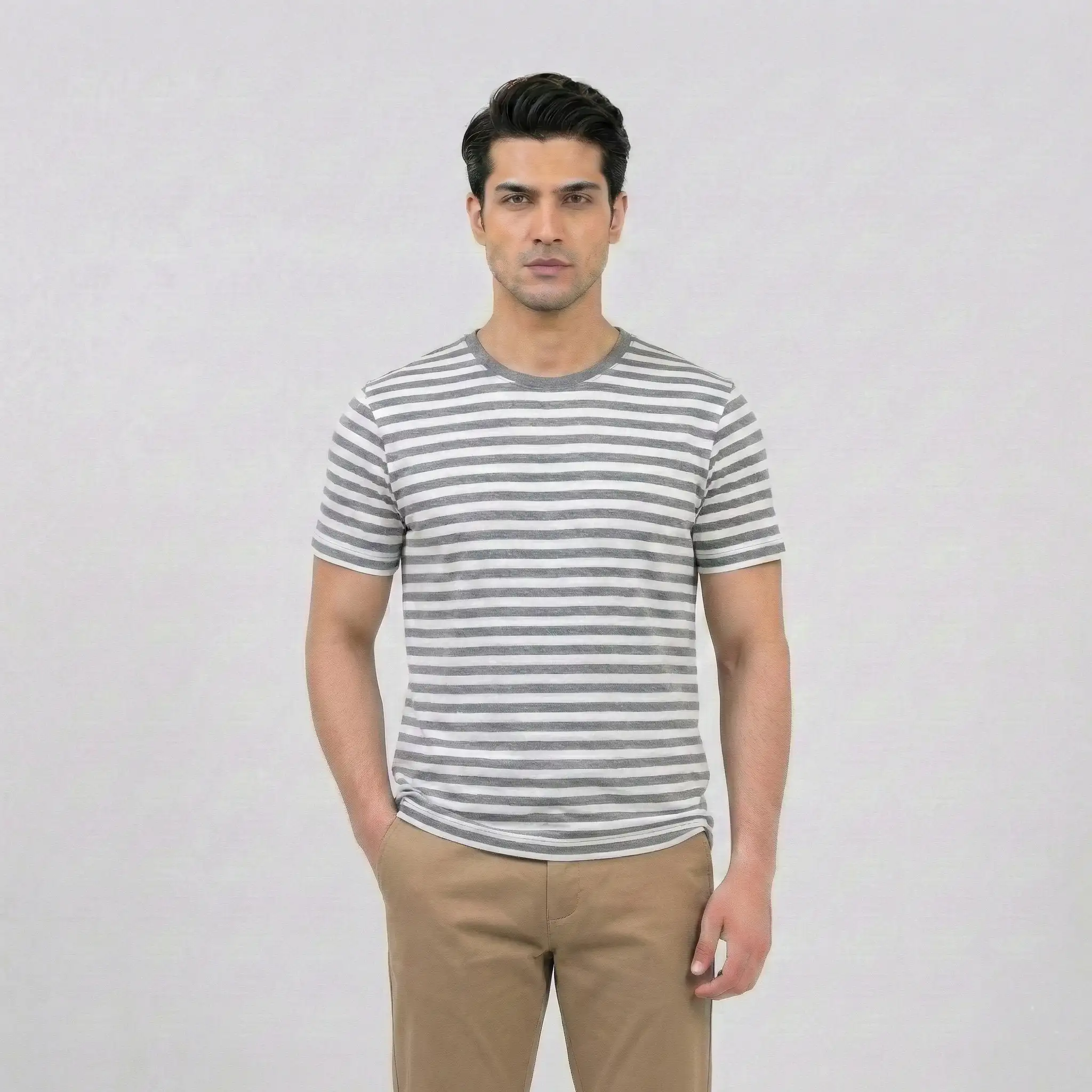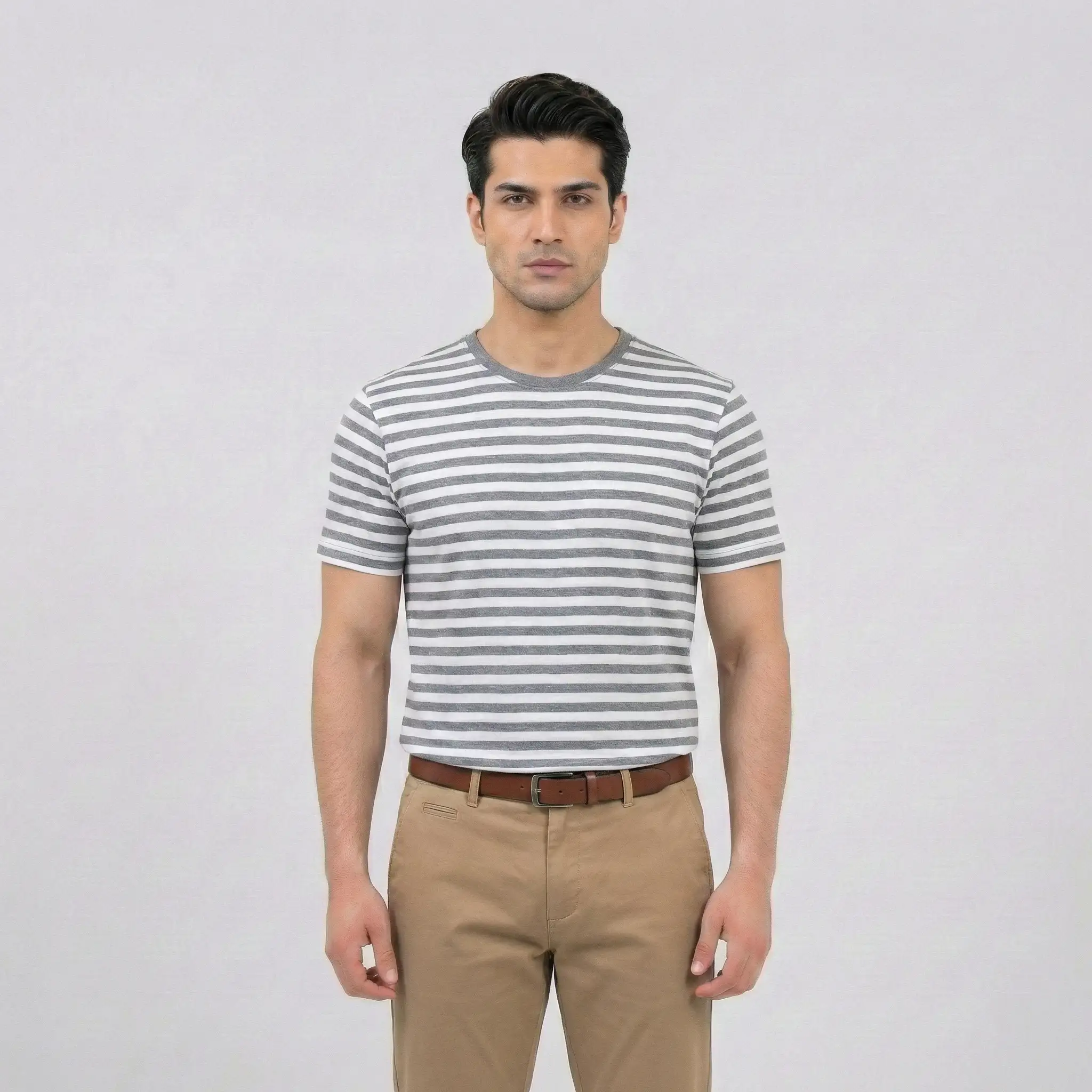 A versatile staple for any wardrobe. This grey and white striped tee is crafted from 100% premium cotton, offering a soft, lightweight feel and a clean, modern aesthetic.