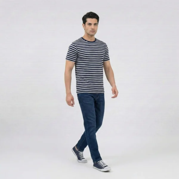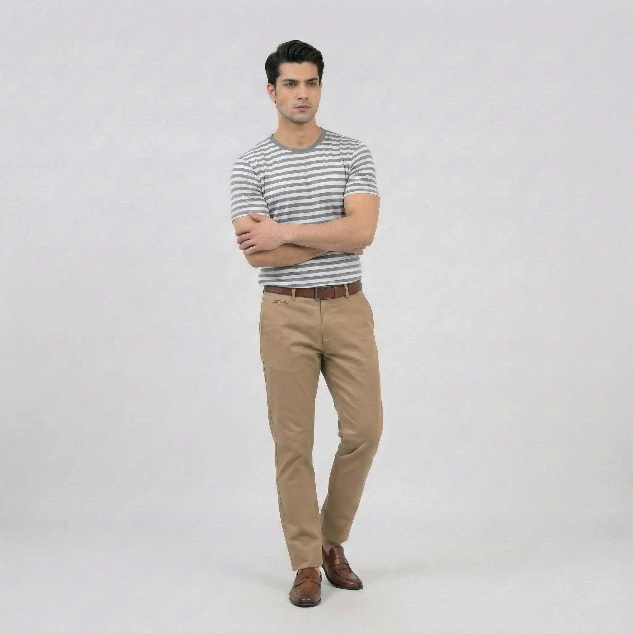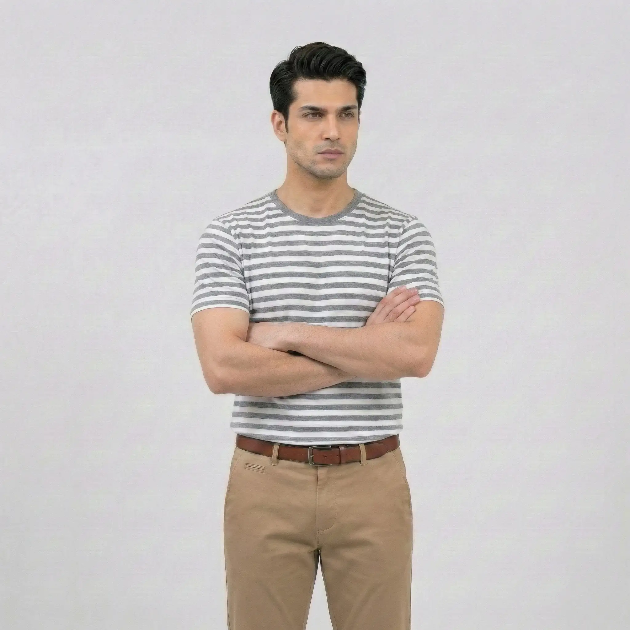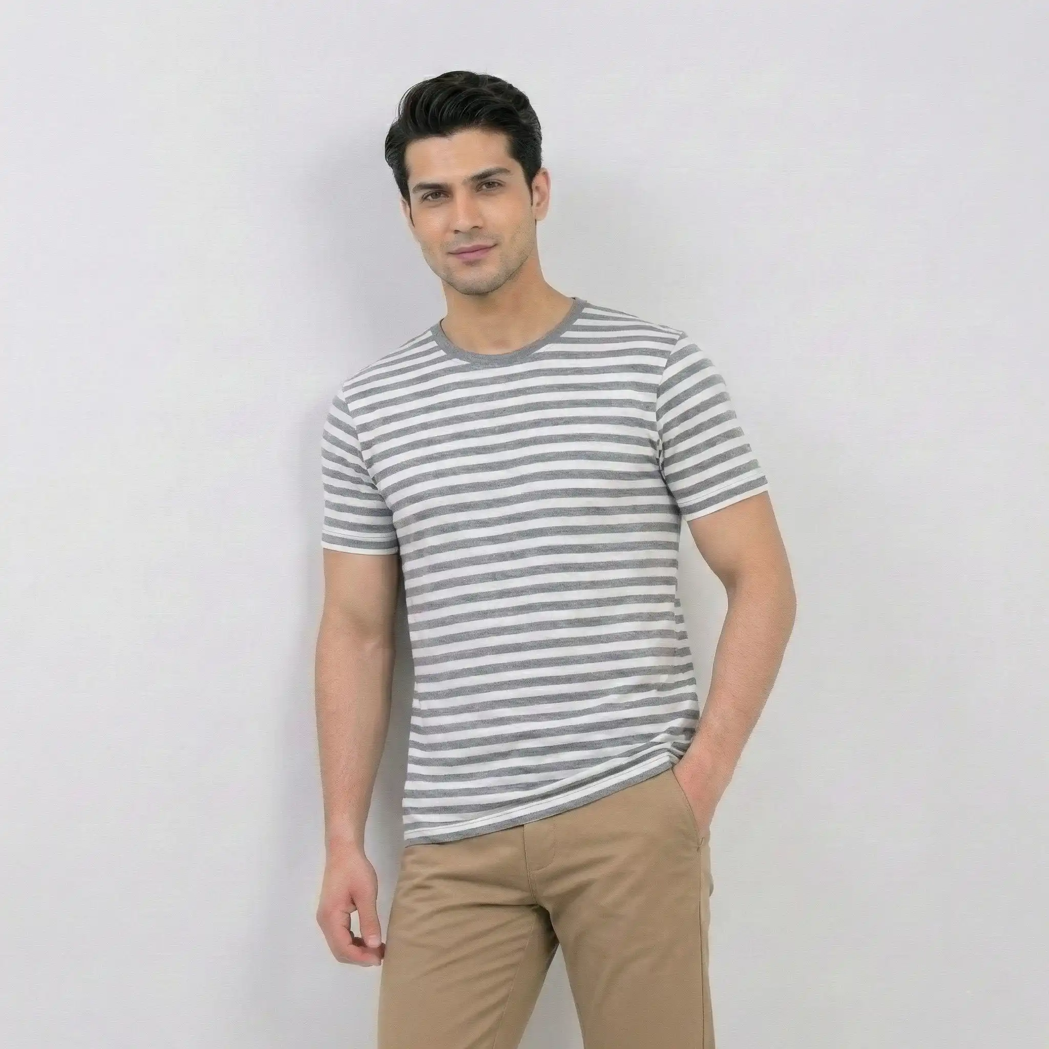 A versatile staple for any wardrobe. This grey and white striped tee is crafted from 100% premium cotton, offering a soft, lightweight feel and a clean, modern aesthetic.