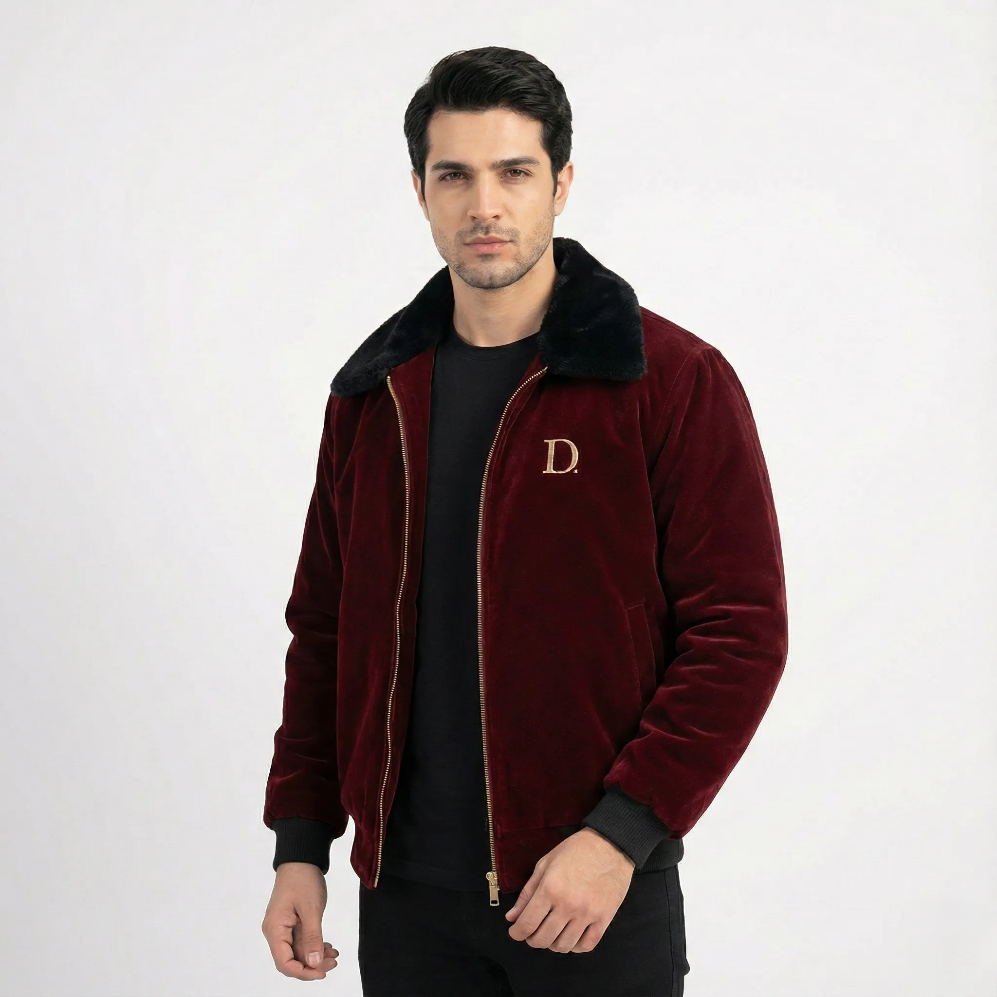 Stay warm in style with this premium Men’s Maroon Velvet Winter Jacket, featuring a soft black faux fur collar, smooth golden zipper, and ribbed cuffs for a perfect winter fit. Luxurious, comfortable, and ideal for cold-weather outings.