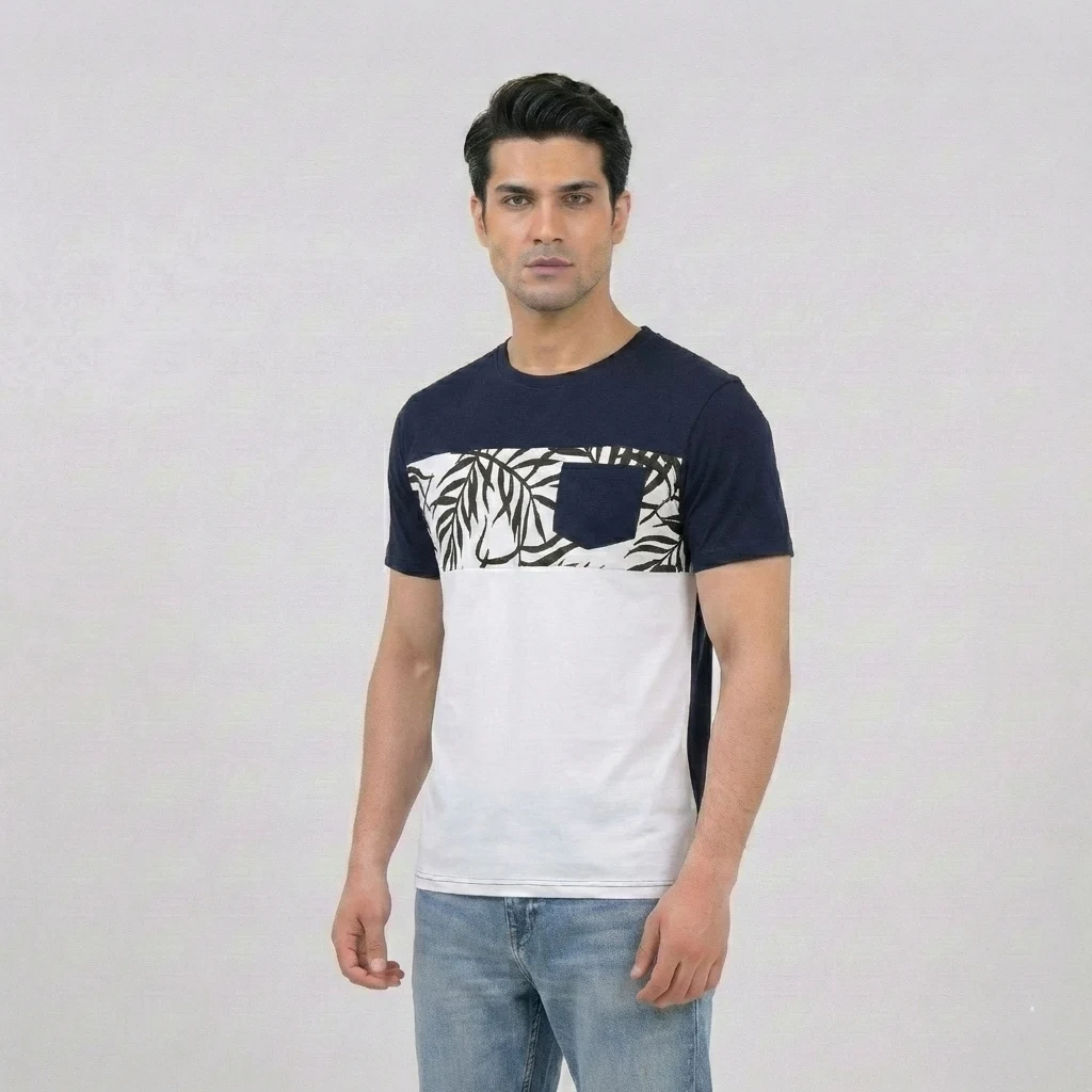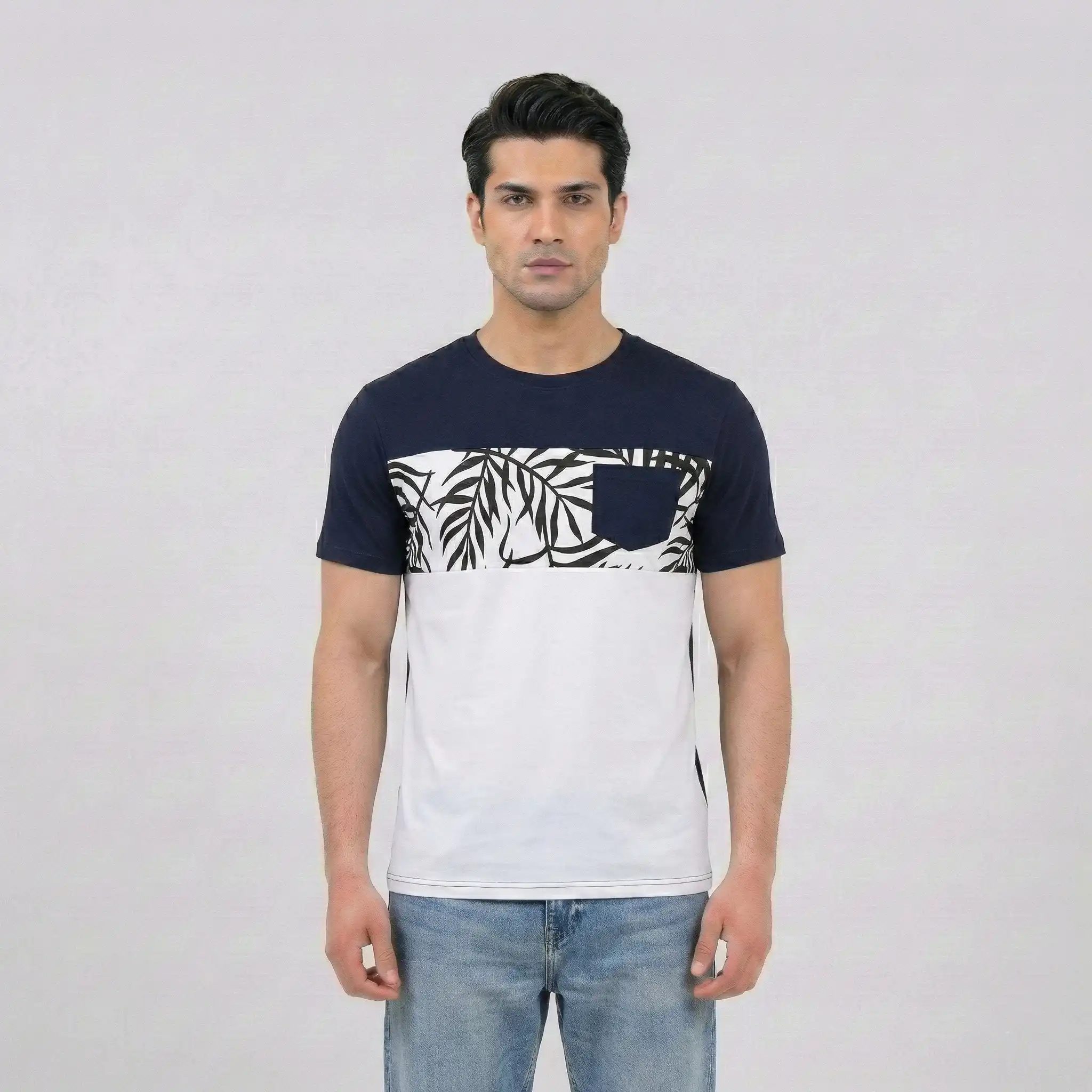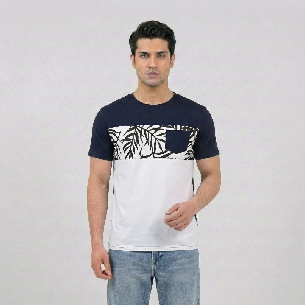Fresh, coastal, and contemporary. This colorblock t-shirt features a bold navy top and crisp white bottom, separated by a striking black-and-white tropical leaf print panel. Finished with a contrast navy chest pocket, it’s the ultimate summer staple for a relaxed yet polished look.