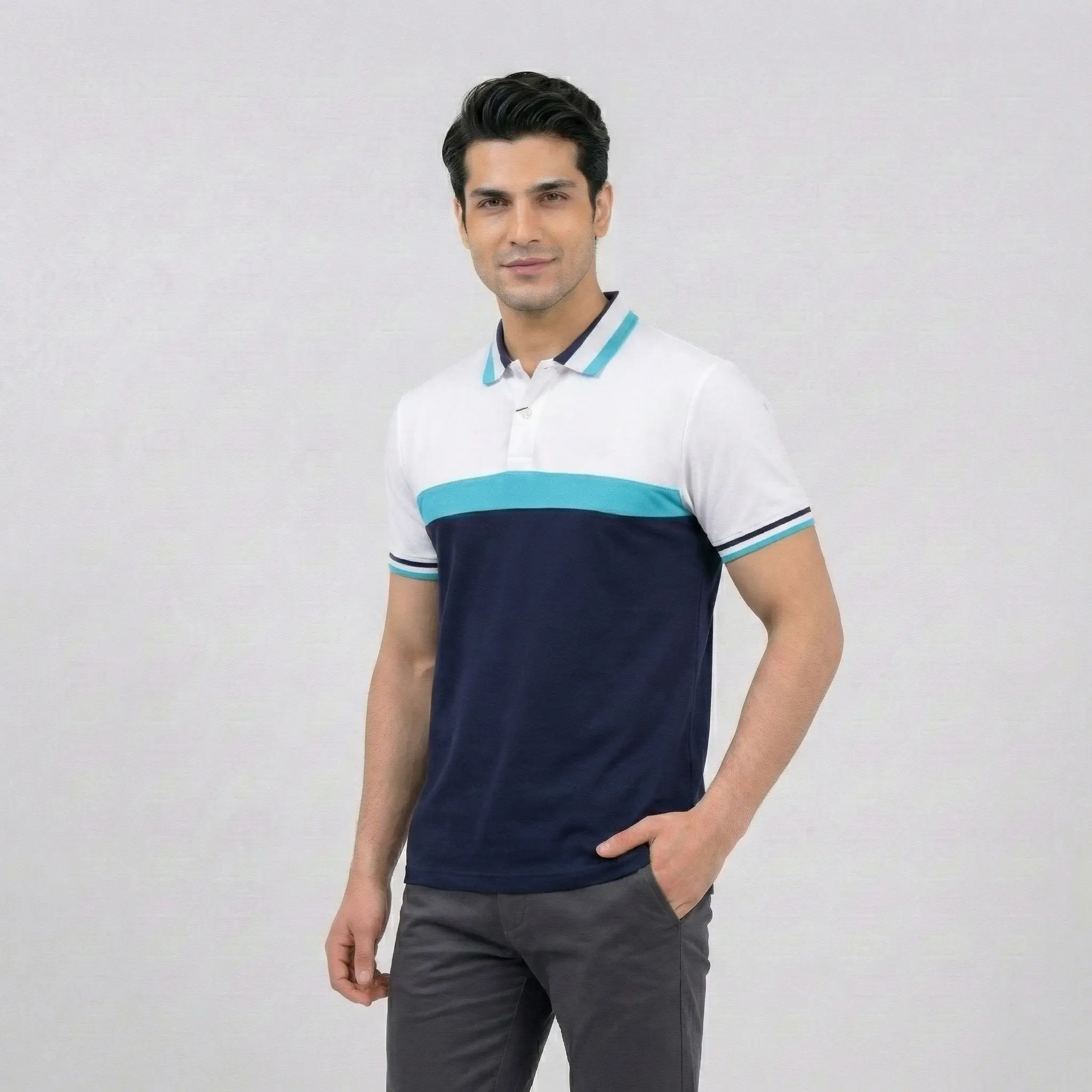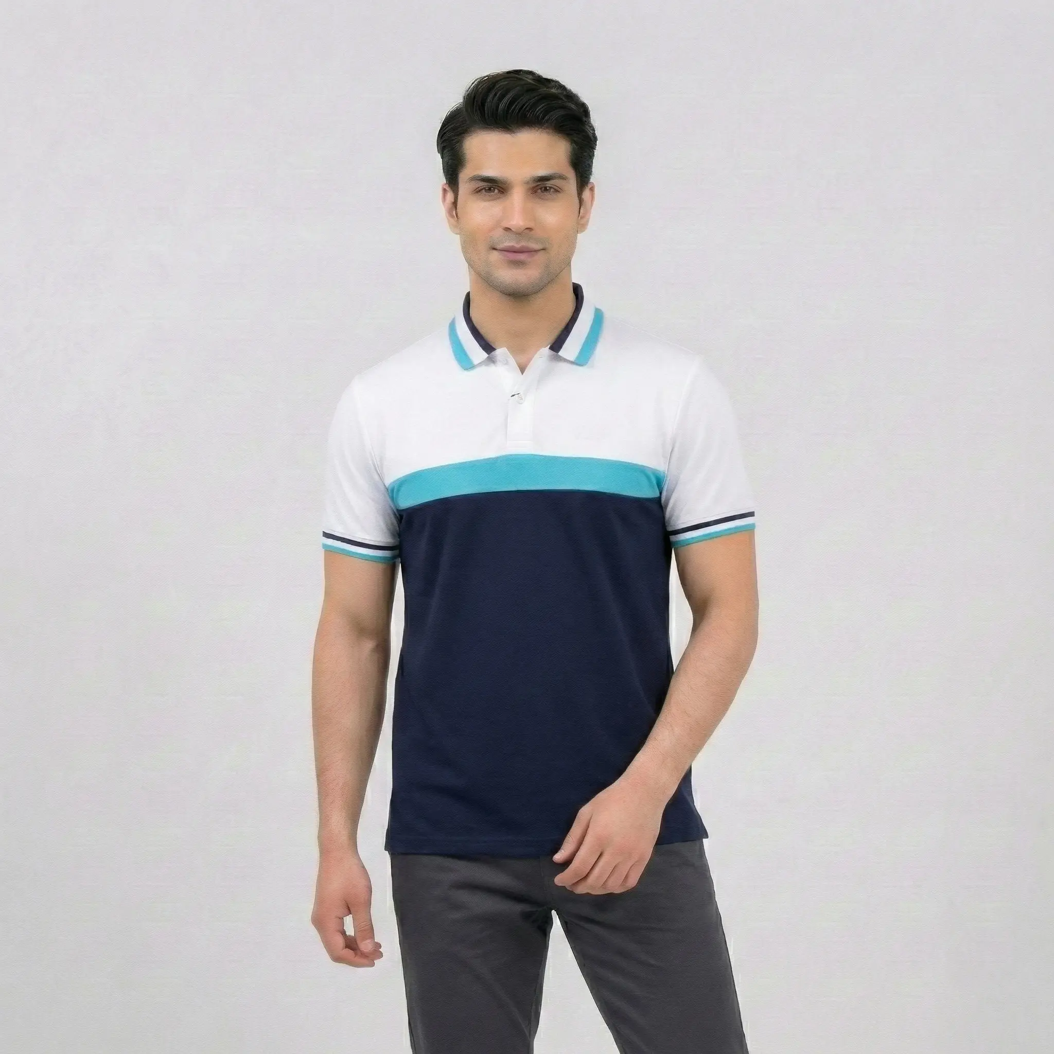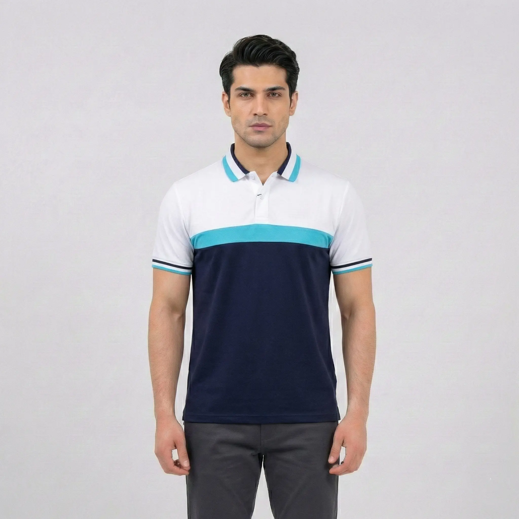 A fresh, sporty Tricolor Pique Polo featuring a bold white, teal, and navy blue panel design. Finished with coordinated contrast tipping on the collar and cuffs, this modern-fit shirt is an essential for any vibrant casual wardrobe.