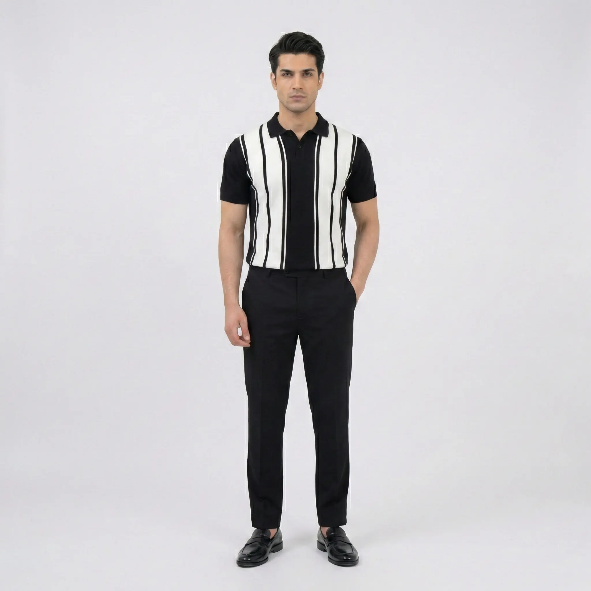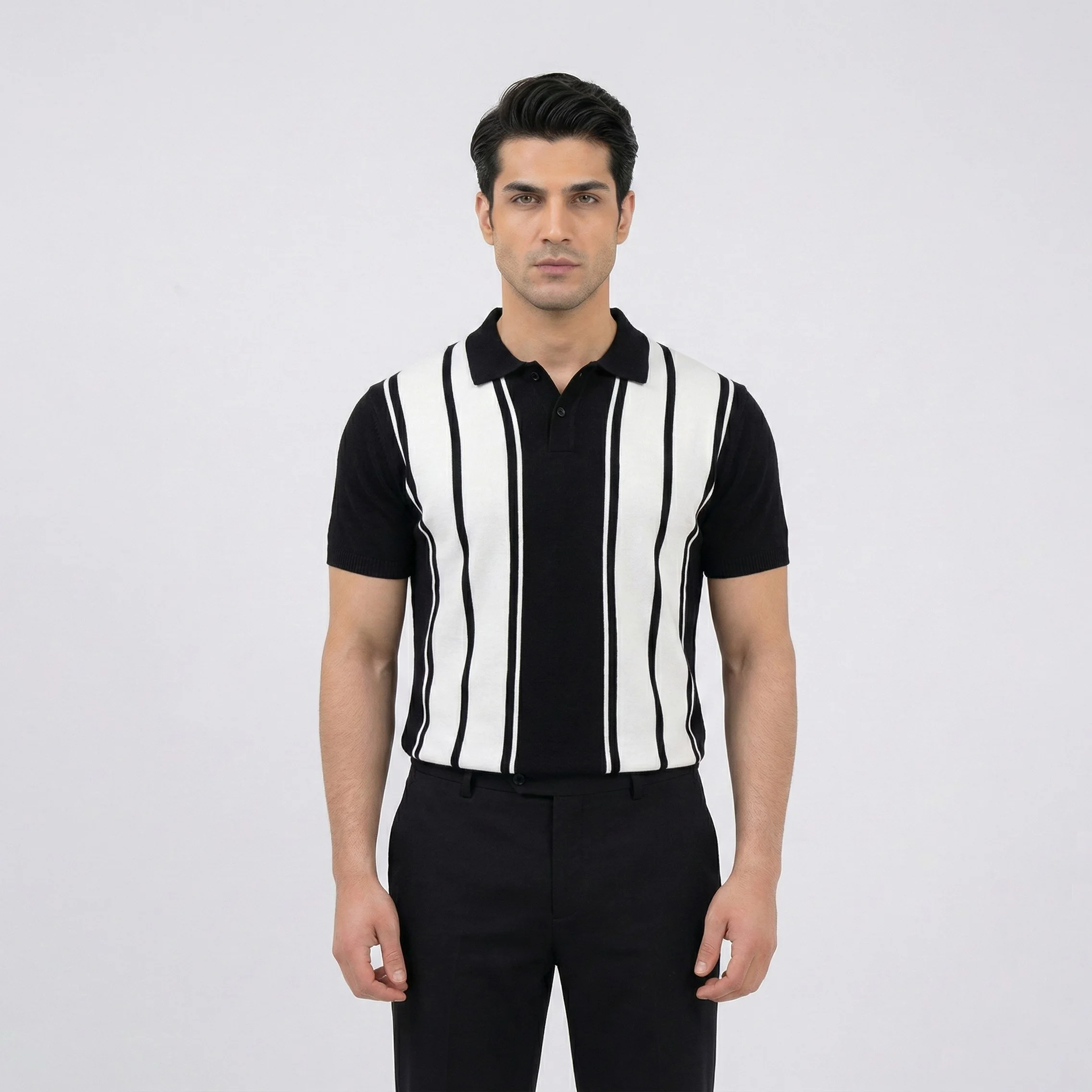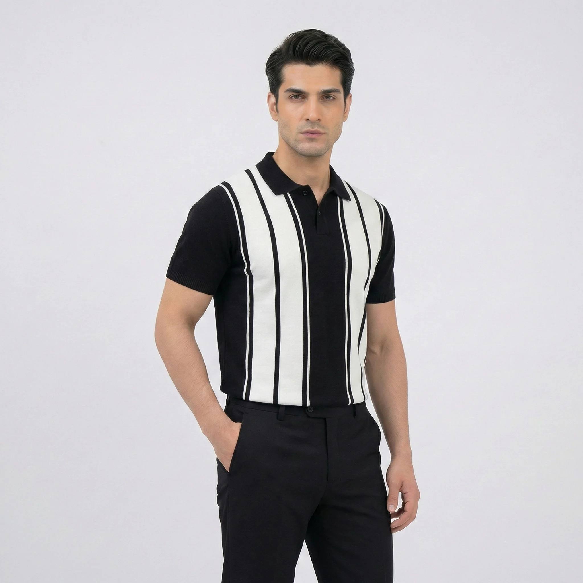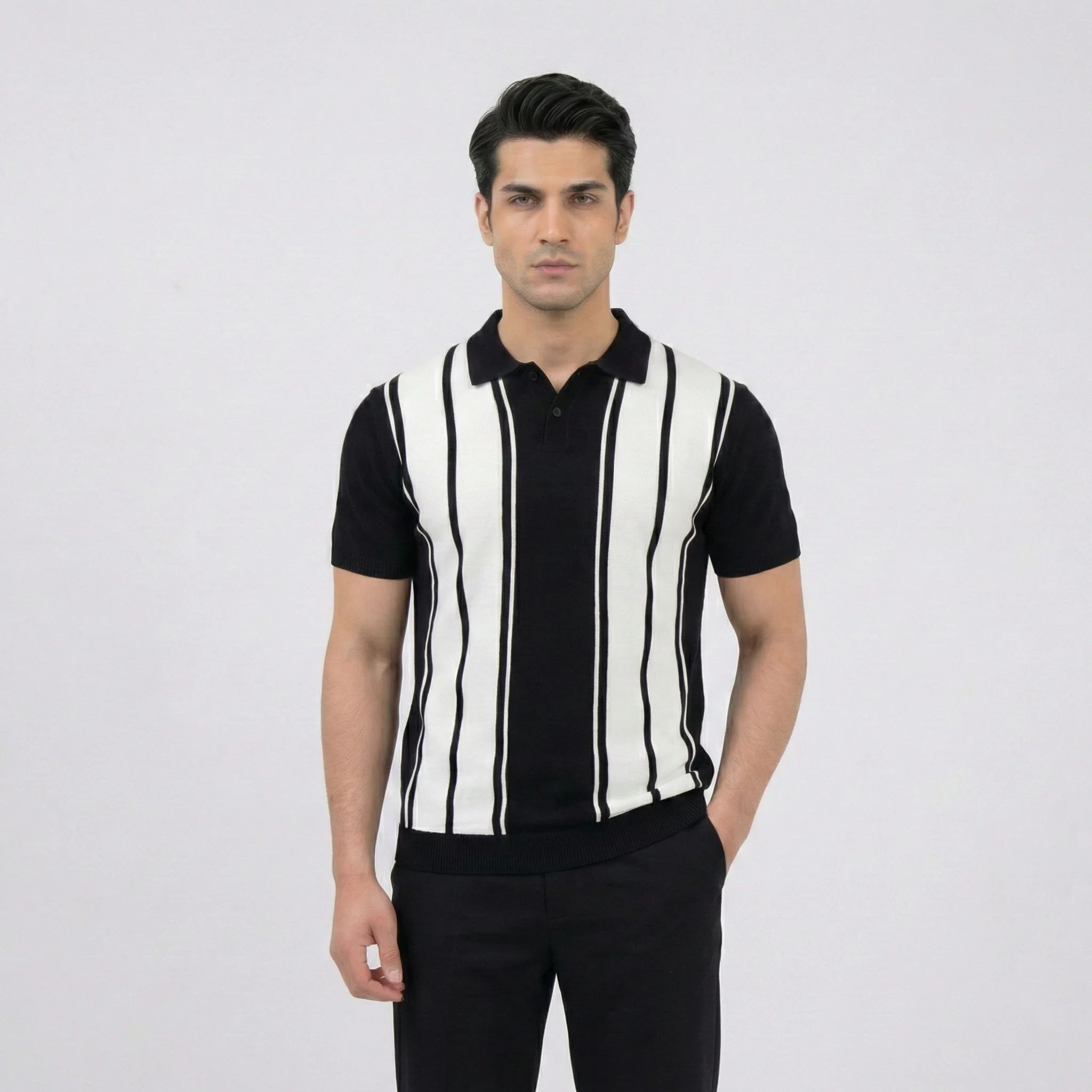 A bold, vintage-inspired knit polo featuring striking black and white vertical stripes. This slim-fit piece combines retro “Mod” aesthetics with modern comfort, making it a standout choice for smart-casual styling.