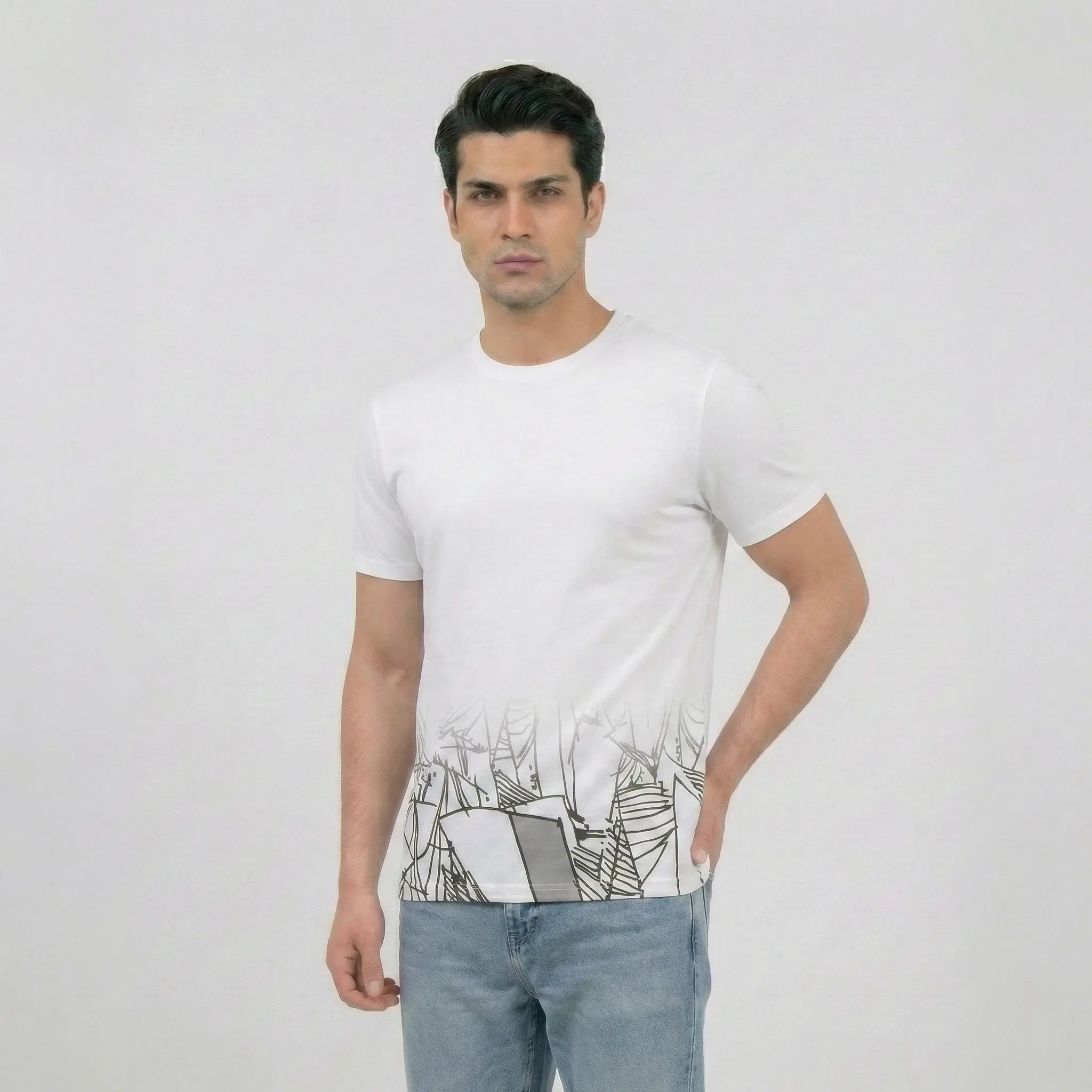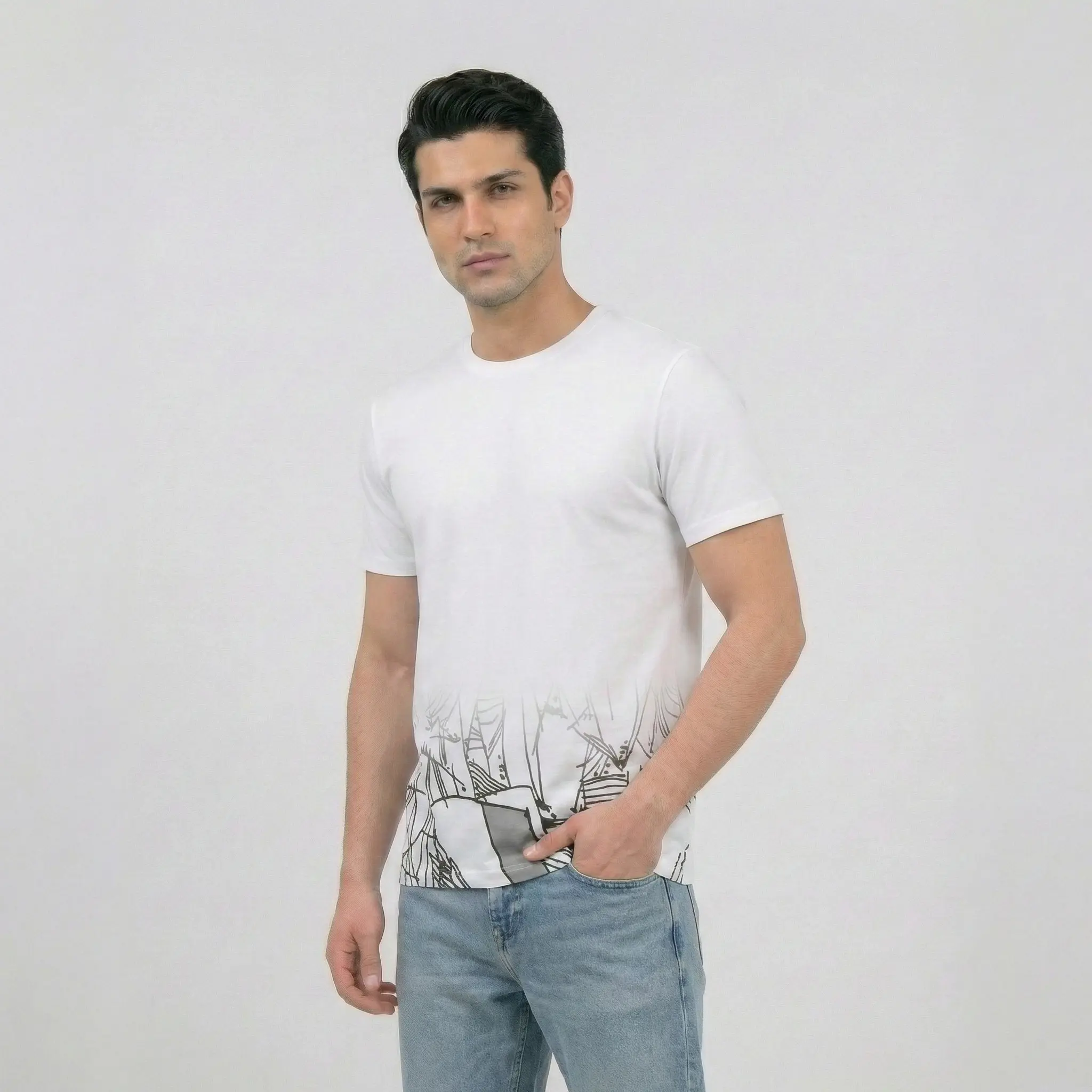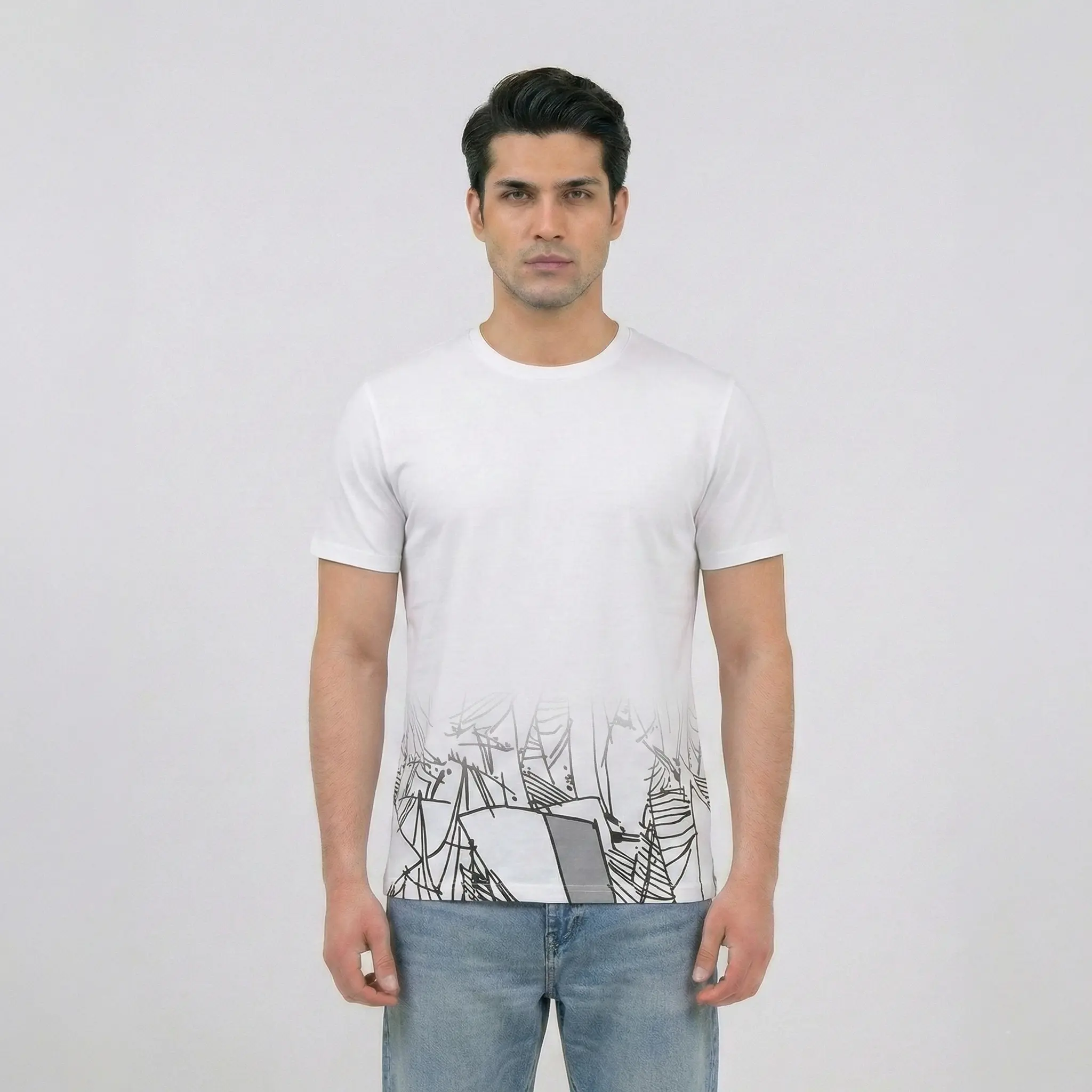 Minimalist meets edgy. This clean white crew neck stands out with a unique, hand-drawn style abstract graphic along the bottom hem for a modern, artistic finish.